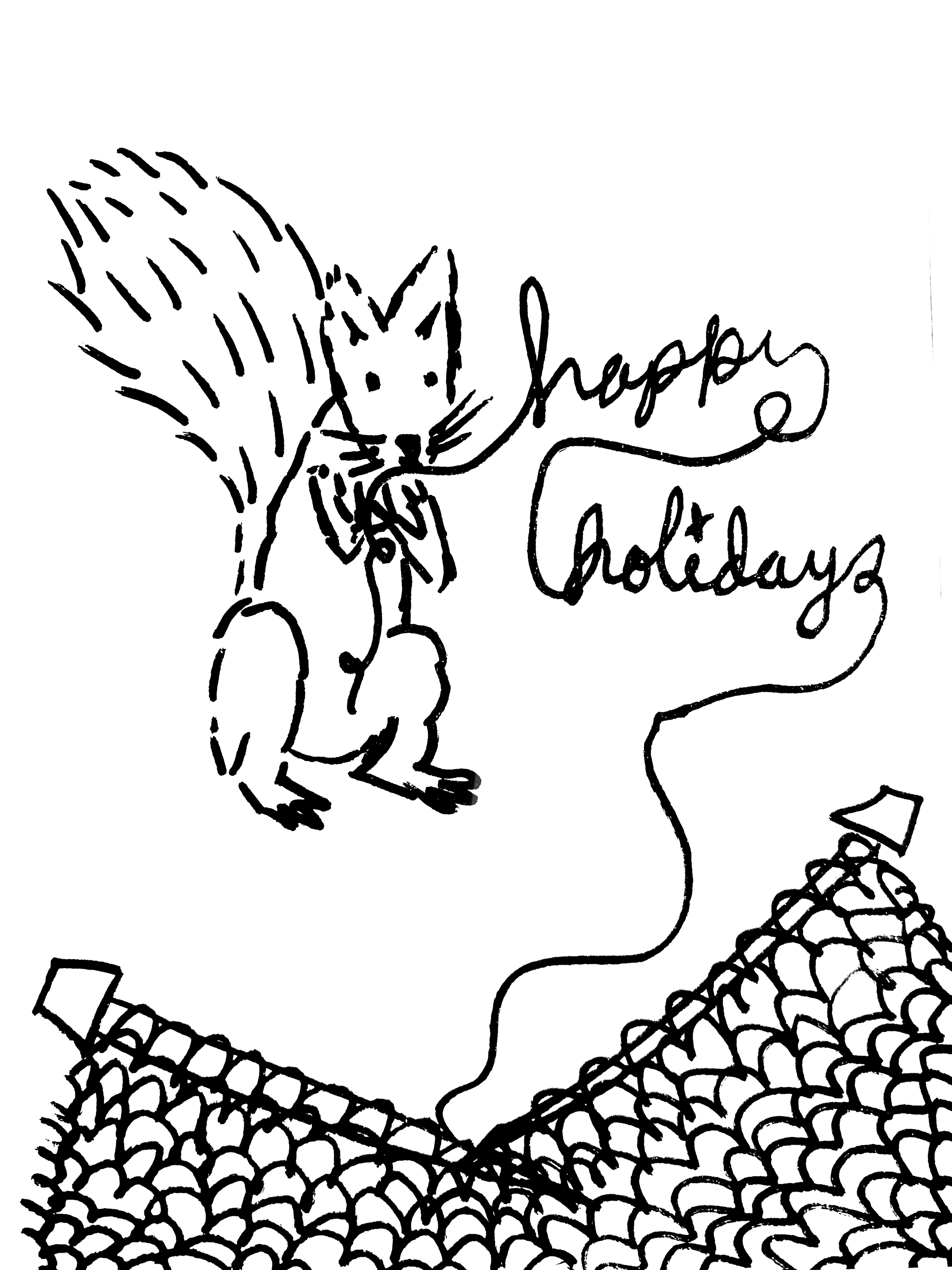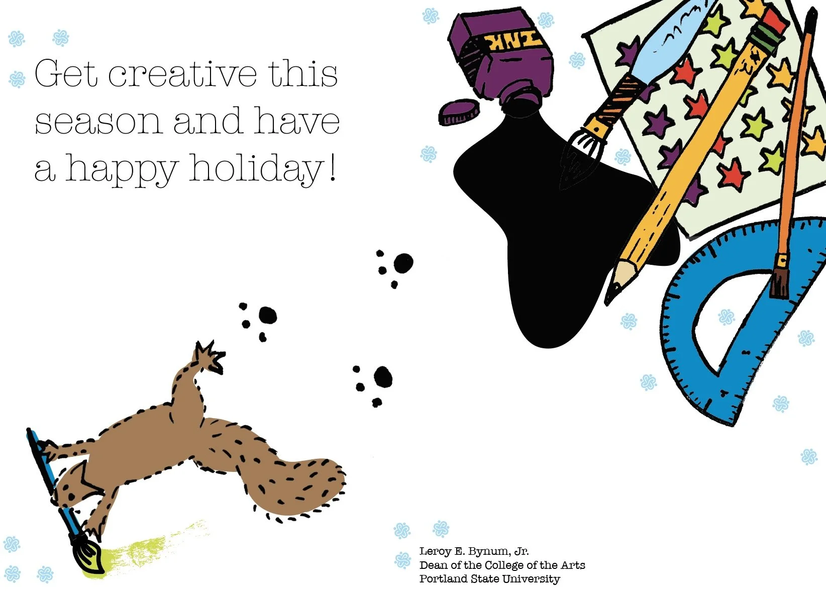 The Dean of the College of the Arts at Portland State University selected my whimsical proposal for the holiday social media posts and email headers. The squirrels are a constant presence on this inner city campus and the tangled yarn reflects their typical mischief. The yarn takes the shape of items familiar to an art and music lover, including the dean’s own beloved horn.